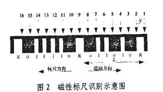 根據(jù)磁敏傳感原理,“凹槽”和“凸槽“會導(dǎo)致不同的磁場強度,從而使磁敏元件相應(yīng)地輸出不同的電半信號“0”或“1”,形成數(shù)值碼,用于確定位移的粗讀值;而標(biāo)志位R碼寬兩倍于碼元“1”寬度的特點,使得識別后的序列出現(xiàn)具有固定特征的標(biāo)識碼,它用于精讀數(shù)。
