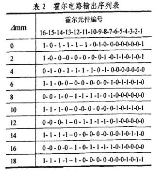 霍爾電路的工作原理是,在外磁場的作用下,當(dāng)磁感應(yīng)強度B超過導(dǎo)通工作點時,霍爾電路輸出管導(dǎo)通,輸出低電-半:若曰值低于釋放點時,輸出管截止,輸出高電半。因此在“凸槽”時鋼質(zhì)活塞桿被磁化,磁感應(yīng)強度曰增加,霍爾電路導(dǎo)通,輸出低電平,用“1”表示;在“凹槽”時輸出高電平,用“0”表示。以第1個霍爾元件為測量基準(zhǔn),從圖2所示時刻起,位移暈旃次變化b=2mm時,一個碼區(qū)行程內(nèi)霍爾電路輸出的二進制序列如表2所示。分析可知,序列的標(biāo)識碼為l 0000000 1,其前面或后面6位序列數(shù)分別為相鄰的兩個數(shù)值碼,這使它具有很強的容錯能力。標(biāo)識碼每隔一個霍爾元件間距N在低位部分右移一位。值得注意的是,標(biāo)識碼前面的數(shù)值碼代表磁性標(biāo)尺當(dāng)前檢測位置下一個碼區(qū)的值。
