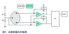 圖5所示為一個完整方案的框圖,該系統(tǒng)是由電池供電并可使用LM2623來提供3.3V的電源電壓。通過電極量度出來的電流之后會經(jīng)由一個運算放大器被轉(zhuǎn)換成一個電壓,這個電壓再被送到微控制器處理,最后顯示在LCD熒幕上。