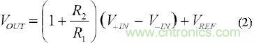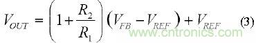 由于輸入之間的電壓等于反饋(FB)與參考(REF)端子之間的電壓時(shí),放大器的反饋要求可得到滿(mǎn)足,因此,我們可將該公式重寫(xiě)為