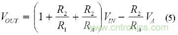 注意,從VA至輸出的增益為反相。VA的增加會(huì)使輸出電壓降低,比值為R2和RA之比。此比值下,可以針對(duì)給定的輸入失調(diào),使調(diào)整范圍達(dá)到最大。由于調(diào)整范圍指向增益之前的放大器輸入,因此,即使在低分辨率源的情況下,也可實(shí)施微調(diào)。由于RA一般都比R1大得多,因此,我們可以得到等式(5)的近似值: