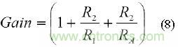其中, VIN(MAX)為傳感器預(yù)期的最大失調(diào)。等式(5)同時(shí)顯示, 調(diào)整電路的插入會(huì)修改從輸入到輸出的增益。即使如此,其影 響一般也很小,增益可以重新計(jì)算為: