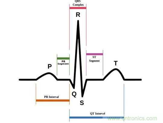在心率監(jiān)護(hù)儀或者運(yùn)動(dòng)設(shè)備中,人們可以根據(jù)心電圖中的P-QRS-T波峰信息中的幅度和時(shí)序、或者只是R波峰的時(shí)序等信息,得到復(fù)雜的心電向量圖,典型的心電圖。如圖一所示。